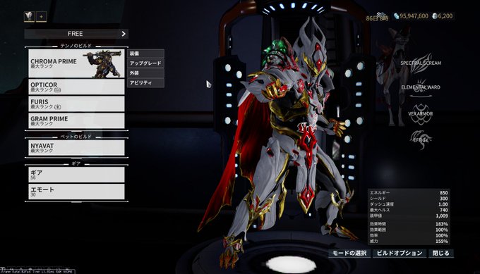 クロマプライムでけた。絶対死にたくないマンビルドとカラーと外装もバッチリ。元が良すぎるので普段どおりに組んだらエスカフローネみたいになって満足。 #Warframe