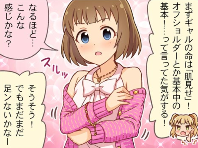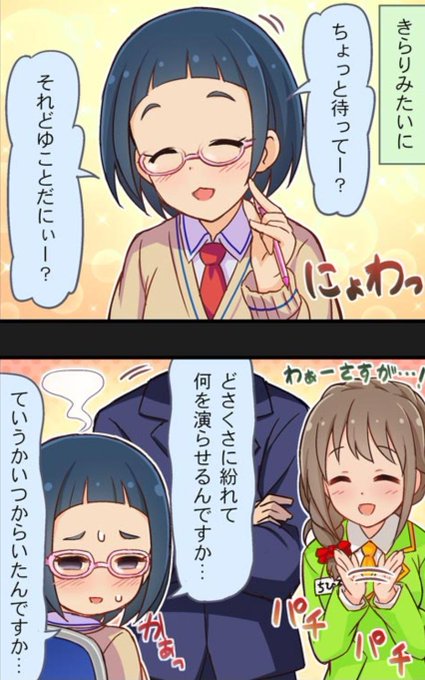 ちょっと面白い表情のシン劇忍詰合せ。 たまに真面目さが面白い方向にから回るのもかわいいです。 …なにげにあと奈緒と絡めば、トライアド全員と一緒のお仕事したことになるのですな。 #工藤忍をトップアイドルに