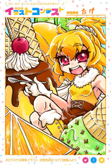 イラコンやっていたので!折角なので!赤も青も好きだけど、ふとプリンが描きたくなったので!黄色で! #ピクスケ6周年イラコン #黄色派 https://t.co/TA56o5QkB2