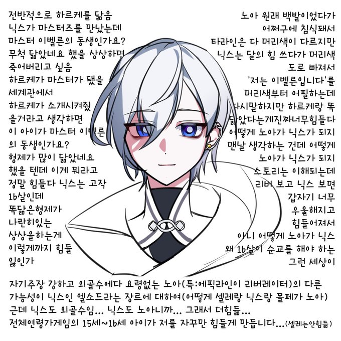 닉스 좋아하는 점 쓰다가 슬퍼짐... 닉스 좋아하는 부분 중에 하르케를 많이 닮은 점도 있어서 하르케랑 닉스 나란히 있는 거 보고 싶은데 생각하는 것만으로도 너무 힘들다