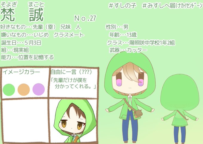 #すしの子 #すしの子ぷろふぃーる カレンちゃんの弟、誠くんです。鞄に付いている人参のキーホルダーは塁に貰いました。誠くんの家宝ですね( ̄ー ̄)ニヤリ