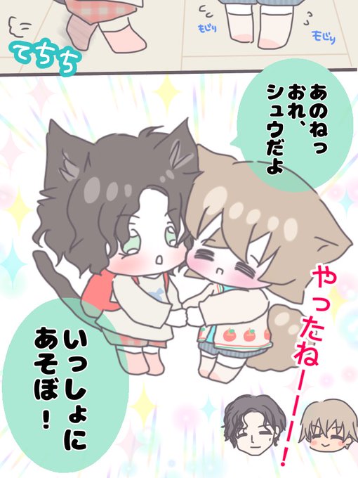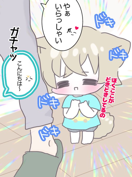 ⚠️ケモ耳&ちぢませ⚠️ あかぃに拾われた子犬のれいくんと れーくんと暮らす子猫のシュウくん② 扉を開けるとそこには子犬のれいくんが待ち焦がれていた新しいおともだちが…!! お互いひと目で大好き同士になったようです☺️モヂモヂ