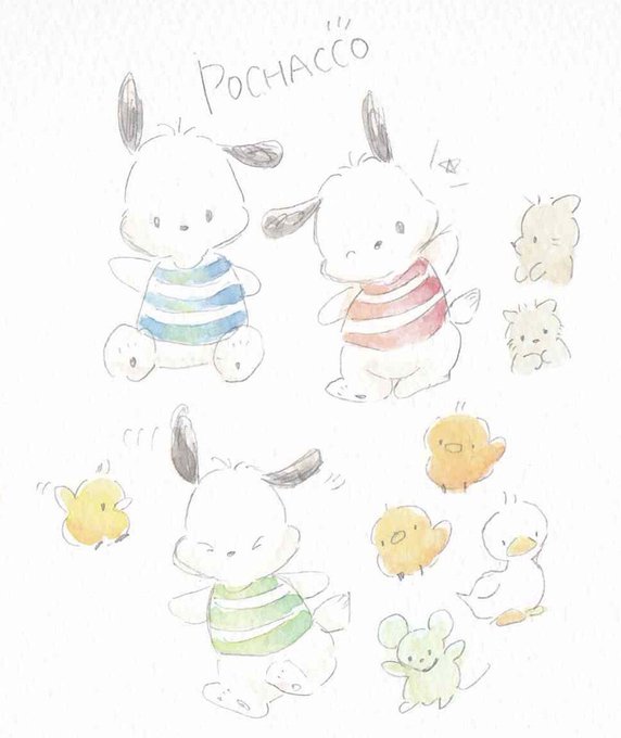 スキャンしたらすごい綺麗に出来たので再アップ失礼します🙏 #水彩 #サンリオ #ポチャッコ #ポムポムプリン #タキシードサム #水彩 #絵描きさんと繋がりたい