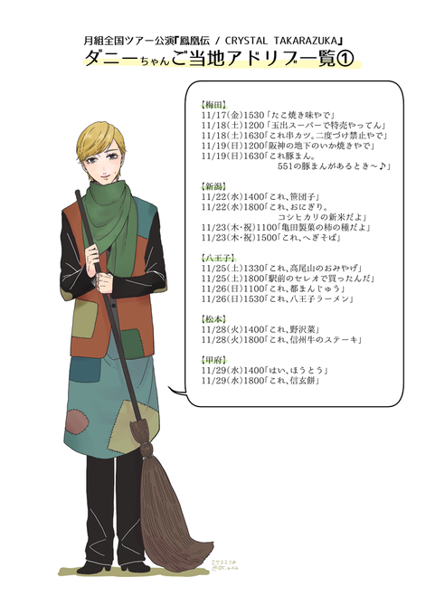 【クリタカ】【絵】月組全ツ Mr.シンデレラアドリブまとめです。ダニーちゃんと一緒に全国回ってるような気持ちになれて楽しかったです! #ダニーご当地アドリブ