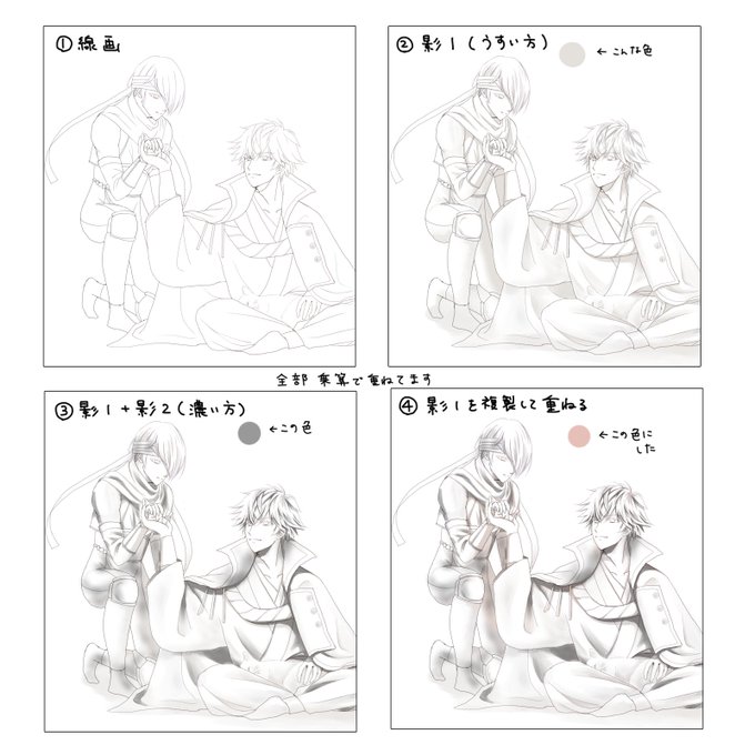 ①影つける、②ざっくり色塗る、③影を乗算で乗せる、④発光追加したりトーンカーブ調整したりして加工