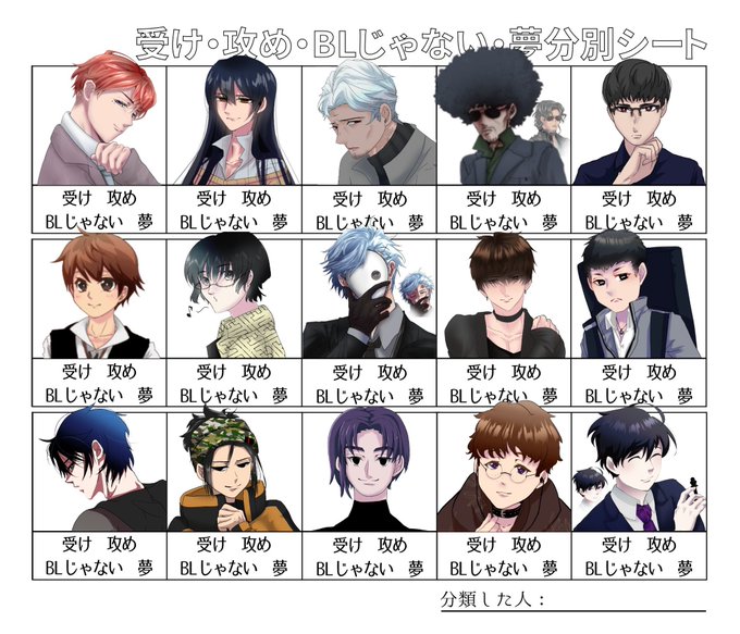 マキさんがやってくれたのが大変好きだったのでついでにこちらにも投げてみる……男性陣を1部ピックアップして受け・攻め・BLじゃない・夢分別シート