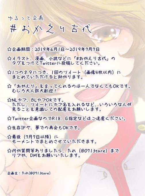 【ゆるっと企画】 #おかえり古代 古代くんのお誕生日に向けて、古代くんを幸せに迎える企画です。画像の説明をお読みの上、ご参加くださいませ。 期間:6/1〜7/7 ※公式タグとの併用は禁止です。 ※質問等ありましたら@0713tareまでリプかDMでお願いします。