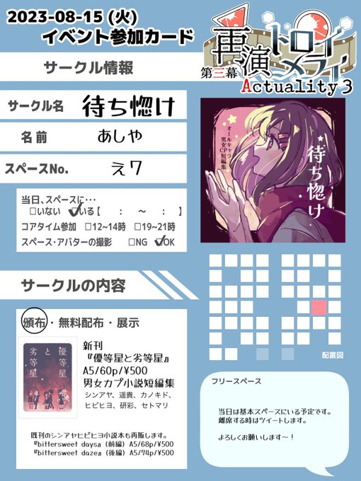 新刊はオールキャラ男女カプ小説短編集です。既刊としてシンアヤヒビヒヨ小説本も再販します。スペースには基本いる予定ですが、一時的に席を外す場合はツイートします。明日、よろしくお願いします! #再演Act3_お品書き