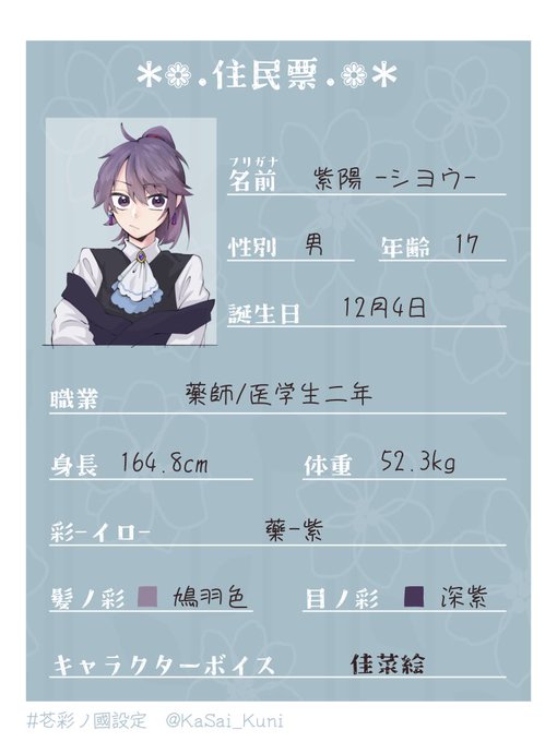 #芲彩ノ國設定 薬師の紫陽です☺💜 相変わらず備考が備考じゃない。