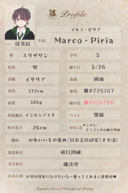 #らすほぐ設定 🐍寮5年♂マルコ・ピリアです🐰💚 かわいいものみんな集まれ〜🪄