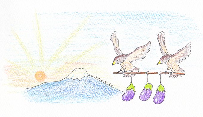 20220102-1 一富士二鷹三茄子 #一日一絵 #イラスト #手描きイラスト #色鉛筆 #初夢 #正月 #一富士二鷹三茄子 #夢 #縁起物 #シャレ #富士山 #ナス #鷹 #猛禽類
