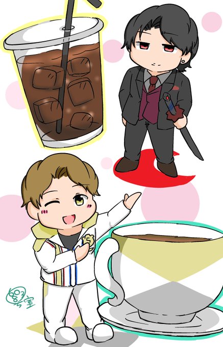 ②と⑧で! 飲み物飲んでるイメージの強いお二人だったので同じ画面に入れました(?) #特撮版深夜の真剣お絵描き60分一本勝負R