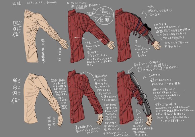 腕鎧は回内位と半回内位において尺骨神経と橈骨神経が比較的体表に近くなる部位(肩から下に向かって上腕二頭筋切れ目、肘内側、手首)だけは鎧が守られている点が重要なのだと考えた。回外位では露出する。(絵は昔の)