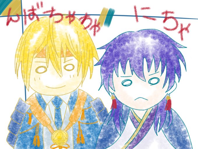つっきー宅(@t_hakka )宝さんと近侍の国広さんお借りしました〜 勝手に……ちび夏が【にちゃかいた!】って持ってきたら可愛いなと思って…描いちゃった………