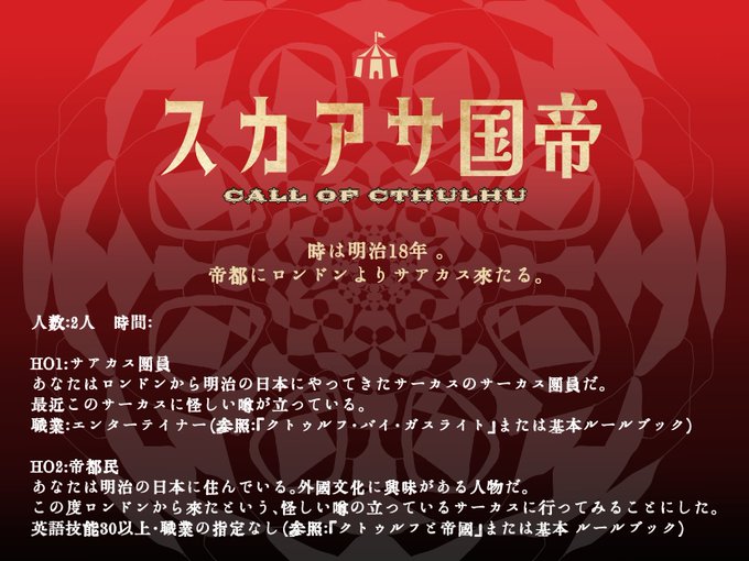 今、お部屋を作っているので、7月以降でクトゥルフ神話TRPG6版「帝国サアカス」を遊んでくれる方がいらっしゃったらお声がけください。テキセで15時間前後らしいのですが、ボイセだと5~6時間かな?と思っています。ガスライトか帝国の探索者で遊べるよ!とてもご機嫌なシナリオです。