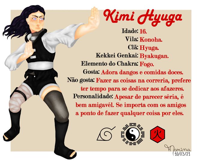 Essa é a primeira Personagem Original (OC) de um projeto pessoal baseado no resultado de alguns testes de personalidade. Bem, aqui está Kimi Hyuga, minha OC de Naruto.