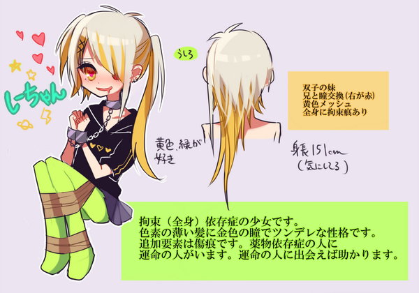 設定を忘れがちだったのでまた貼っておく、、 依存症少年少女というタグで診断して出来た子たちです 眼は眼球を交換してオッドアイになっています 横顔の資料は欲しいと言われたので最近描きました