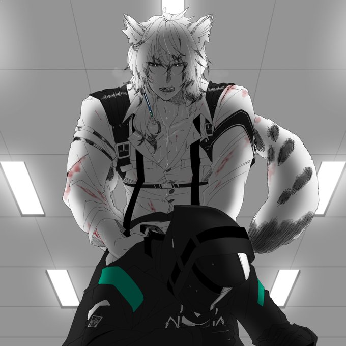 銀博※血注意 戦闘での胸の高鳴りが治んなくって帰投早々着替えも治療もそこそこに博に戯れつこう()とする大型ネコチャン(攻)の図。