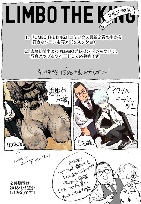 ただいまLIMBO THE KING3巻の発売記念にハッシュタグキャンペーンをやっております。#LIMBOプレゼント をつけて3巻の好きなシーンを写メ、またはスクリーンショットをツイートして完了!どしどし、ふるってご応募ください。150P増量試し読みはこちら🐶→ https://t.co/B9mNMptpat