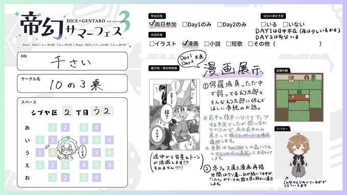 #帝幻祭 お品書き更新したのでお祭り始まる前にお知らせしておきます! スペースは【2丁目う2】です day1は日中不在ですが、夜は恐らくいます 展示更新できるように頑張ります!!よろしくお願いします🙌✨