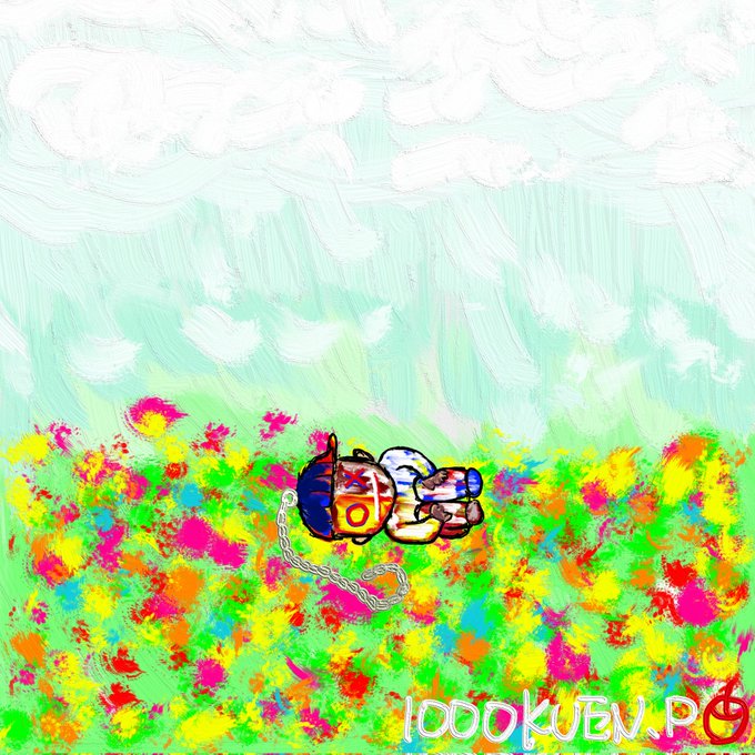 Keychain boy 第二章 王から捨てられたのか?王が落としてしてしまったのか?真相は様々。背景は第一章と変わり鮮やかな野原に寝転ぶ少年を描きました。少年の絵は変わってませんが、どことなく解放されて安堵している様でどことなく寂しさもある様な。背景が変わるだけ少年の存在や見方も変化する