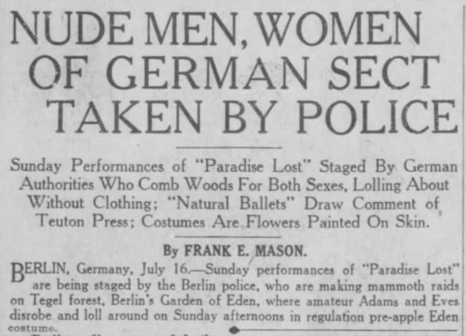 July 16, 1921: Police in Berlin are patrolling the Tegel forest to round up and cover up nudists as they openly loll about. The description of them as a "sect" is likely journalistic exaggeration. The naturist movement has a long, if controversial, history in Germany.