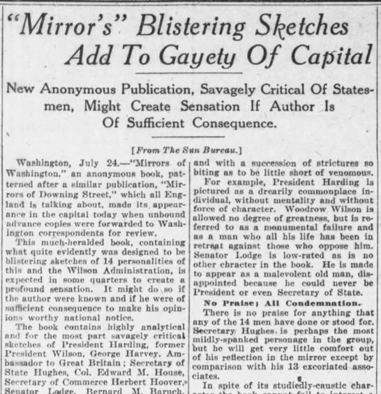 July 24, 1921: Publication of the anonymous book "The Mirrors of Washington" stirs a guessing game all over the capital to find out who wrote the gossipy word portraits of influential politicians, including Presidents Wilson and Harding (caricature from the book). 1/2