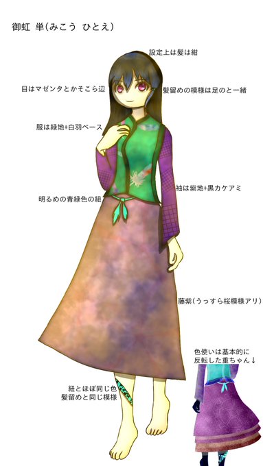 @toikuchi_Nico それは御虹 単(みこう ひとえ)さんですね…ついさっき描き上げた重ちゃんのお姉ちゃんです 1年くらい前に描いた絵だから色々と分かりづらいんだけど設定はこんな感じ