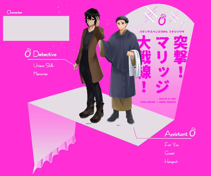 フタリソウサ「お見合い行ったら相手が探偵だったんだが?」 GM:箱山だんさん(探偵/ 善知鳥) PL:じん(助手/ 竜胆) すてきなお部屋で善知鳥さんとお見合いバトルをしてきました!三十三年の付き合いがありながら、互いに日々新しい面を発見している良き二人です。今後も並んで歩いて下さいね。