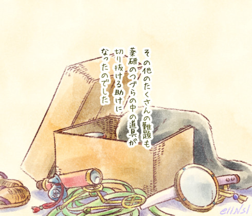 【歌薬昔話パロ 64】 薬研さんの婚礼道具その5~12:一晩で千里歩ける草鞋、千里眼の遠眼鏡、患部を撫でると治る石、どんな獣も乗りこなせる轡と手綱、照魔鏡、超魔除けの小刀(斬鉄)、必要な数になる食器一式、火鼠の毛皮