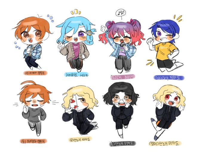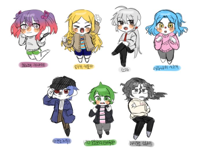 # 나랑_분위기가_닮았다고_멘션_온_캐에게_내_옷_입히기 단매다, 치에부쿠로, 히비키, 키사라기, 슈매다, 금산, 흑산, 얼산, 카나데, 마키, 소라, 이라나미, 슈킨조, 작톨, 하시모토 멘션 받아서 그렸습니다. 어.. 손목 아파요ㅎ