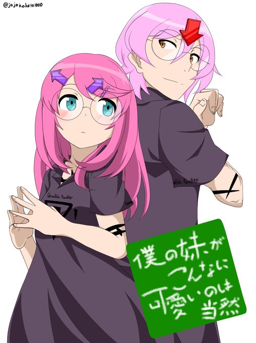 ※キャラデザ捏造注意 フォロワーさんのネタお借りしました!俺妹の内容あんまり知らんので、とりあえず兄妹で表紙トレスをば…2枚目は文字なし、3枚目はトレス元画像です