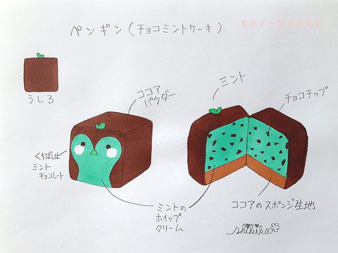 『ペンギン(チョコミントケーキ)』 チョコチップ入りミントホイップクリームをのせ、ココアパウダーをまぶしてミントの葉を添えた爽やかな味わいのケーキのどうぶつです ▽minne https://t.co/513RDsUjie @minnecom #minne #手作り #ゆるキャラ #スイーツ #チョコミン党 #ブローチ #文具 #マグネット