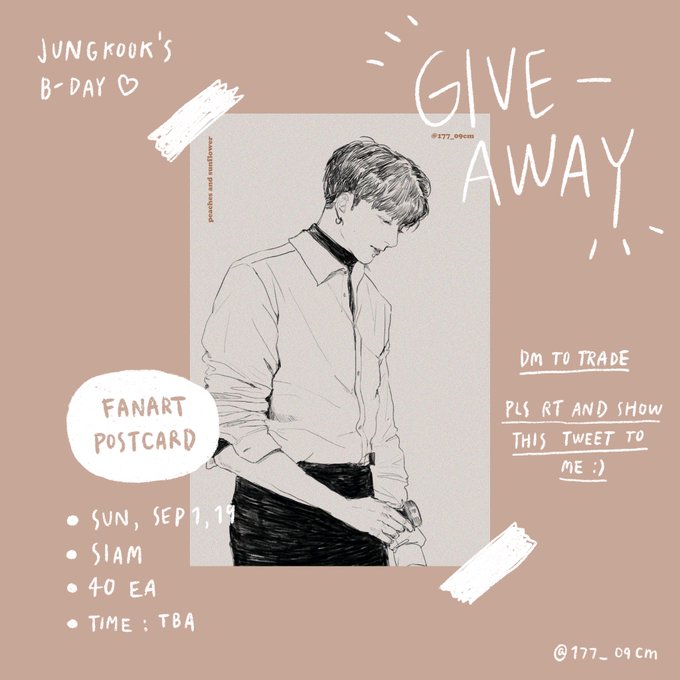 — fanart postcard giveaway 💘 🐰 date : sun 01/09 🐰 location : siam 🐰 time : tba please retweet and show this tweet to me on that day วันเกิดจองกุกเรามีโปสการ์ดไปแจกด้วยนะคะะ สนใจแลก dm มาได้เลยค่ะ 💕 #HappyJungkookDay