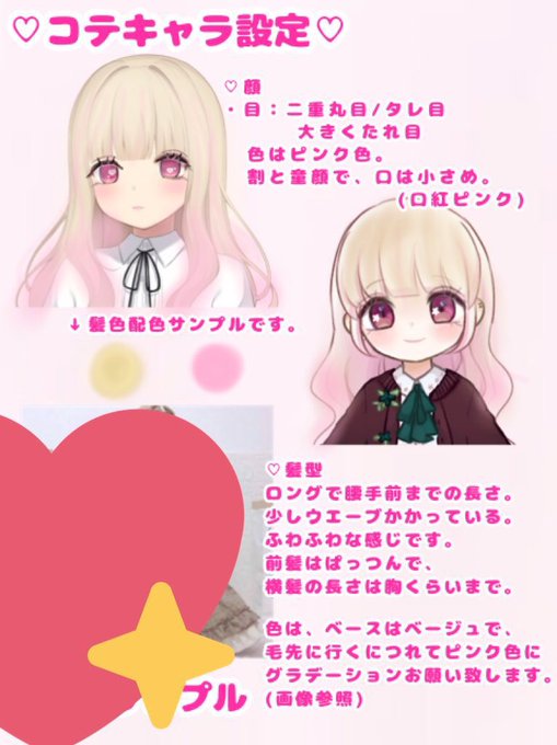 画像の1枚目にお相手様の名前、2枚目が今回希望するお相手様の服装で、3枚目がコテキャラ詳細で、4枚目にコテキャラ希望の服装です🙌🏻