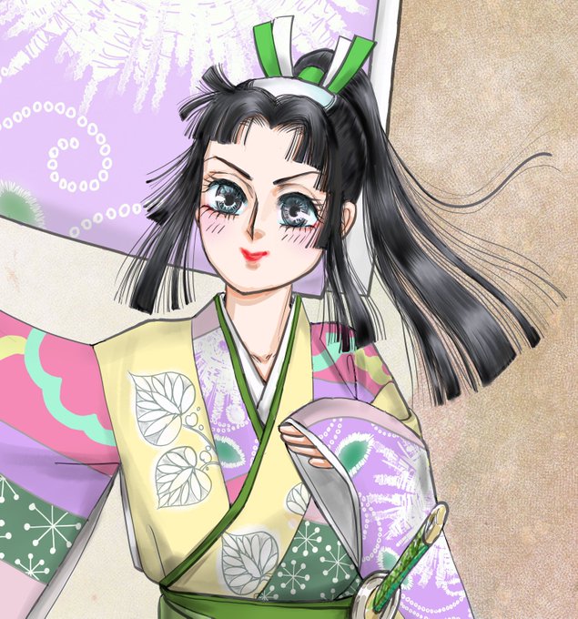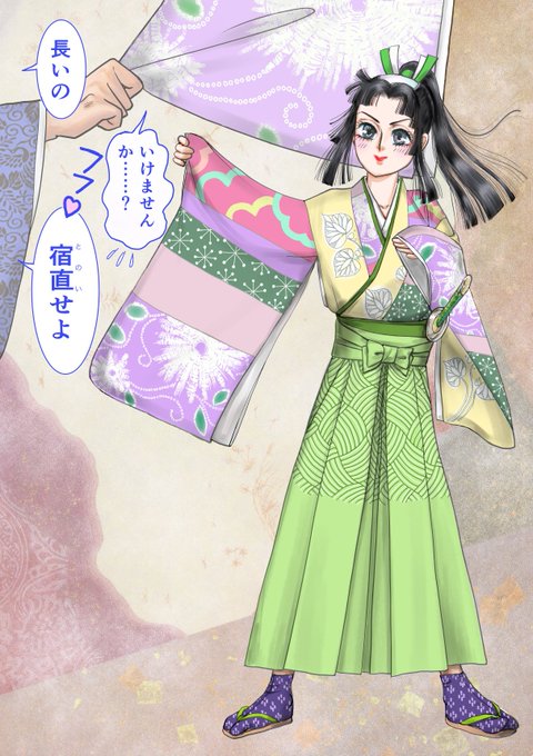 お題は『恋』 髪の毛を掴まれて信長様に「整えよ」『マネは要らん!」と言われて真っ赤になった乱丸くん。続く「おまえを見せよ‼」に着る物の工夫します。着物は片身替わりに女物の布のパッチワーク、袴は最初に母親が用意してくれた物でした。結果は……