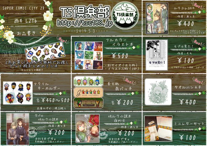 5/3スパコミ、TS倶楽部のお品書きです。 1点でもお買い上げの方に無配ドット絵本をお渡しします。 画像には載せていない在庫わずかのグッズと以前のイベントで作った無配などもあります。よろしくお願いします。