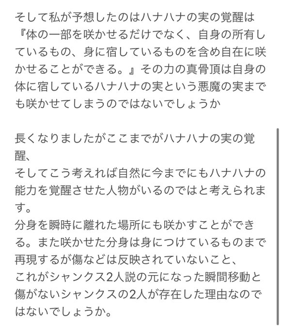 シャンクス ハナハナの実説 ふざけているようで真面目な考察です。 同じ能力者が同時に存在しないワンピースの設定を承知の上です。 1 世界政府がニコロビンを狙う理由 2 シャンクス2人説 この二つを起点に考えました。 #ワンピース考察 #シャンクス #ニコロビン #悪魔の実