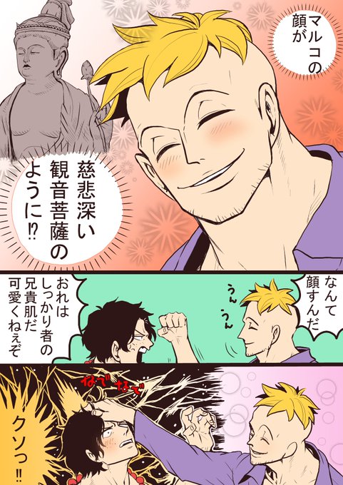 マルコは好みのタイプがオヤジと同じで 無鉄砲で心配な子が可愛くて大好きな菩薩のような人 って思って描いたけど、原作にそんな記述なくて驚いてる。 ・・・なのでこれはただの幻覚を見た私の妄想。