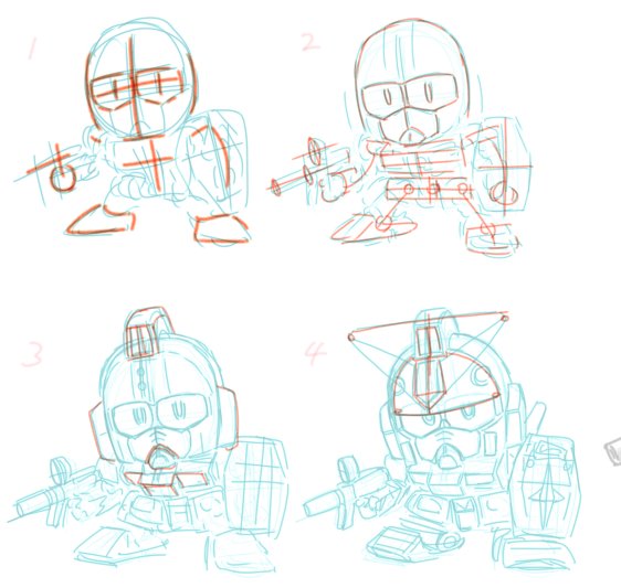 1でポーズを決める この時は頭や手足の先端部分をどう配置するかを考えることに集中する 2パーツ配置が決まったらそれを繋げつつ各パーツのパース方向を確認しながら微調整を入れる 3特徴的な部分をしっかり描いていく 4それに上から付けるパーツを被せていく