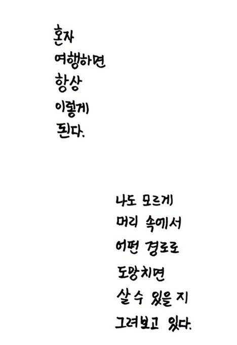 혼자서 여행하면 항상 이렇게 된다. 나도 모르게 머리 속에서 어디로 도망치면 살 수 있을지 경로를 그려보고 있어. 여자 혼자서 시골을 여행한다는 것은 https://t.co/cBV8NECqFa