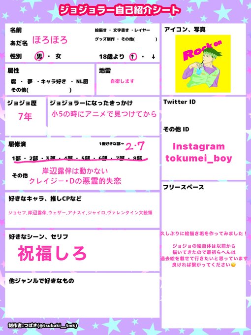 #ジョジョラーさんと繋がりたい #ジョジョラー自己紹介シート #ジョジョ好きと繋がりたい #RTした人全員フォローする 初めて自己紹介シートというものをお借りして作ってみました!僕の絵が誰かに刺さればいいなと思っています。フォローよろしくお願いします