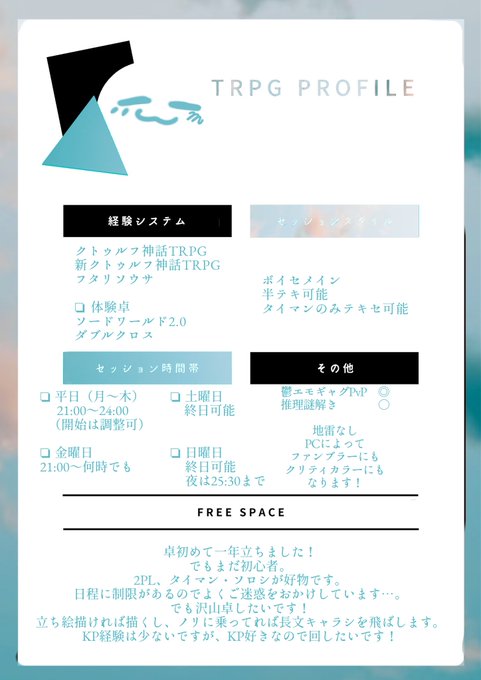 ❏ 固定用 更新しました! 最近は参加回数が減っていますがゆったりと遊んでいますー! 立ち絵描いたり、長文キャラシを作成したり、ふせで暴れたり。 KP回数も増えてきました☺ これからも沢山遊びたい! #TRPG自己紹介シート