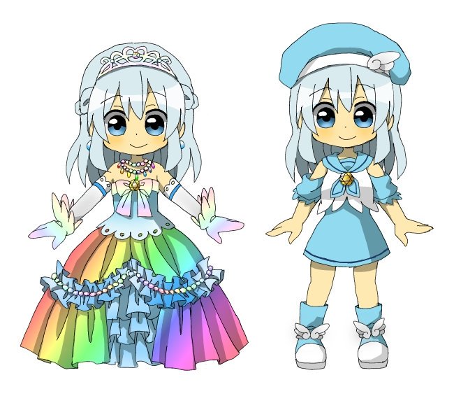 例の魔法少女(お姫様)のやつ。空の国のお姫様でエンジェライト姫。エンジェちゃん。右がお忍び用の服で左が変身した時のドレス