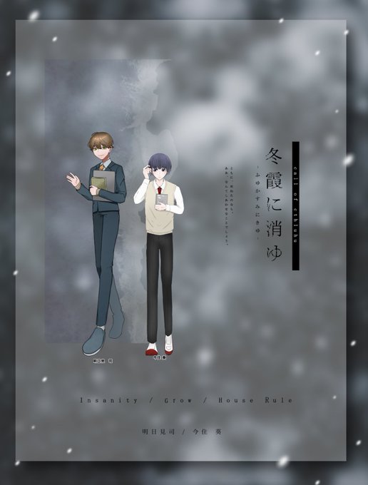 CoC「冬霞に消ゆ」 KP:しの PC: HO1/明日見 司(ささき) HO2/今住 葵(アサガオツェロギー) END-R/a 両ロストにてシナリオ終了です。 泣きました……うぁぁあああ………… とっても幸せでした、、ありがとうございました😭😭