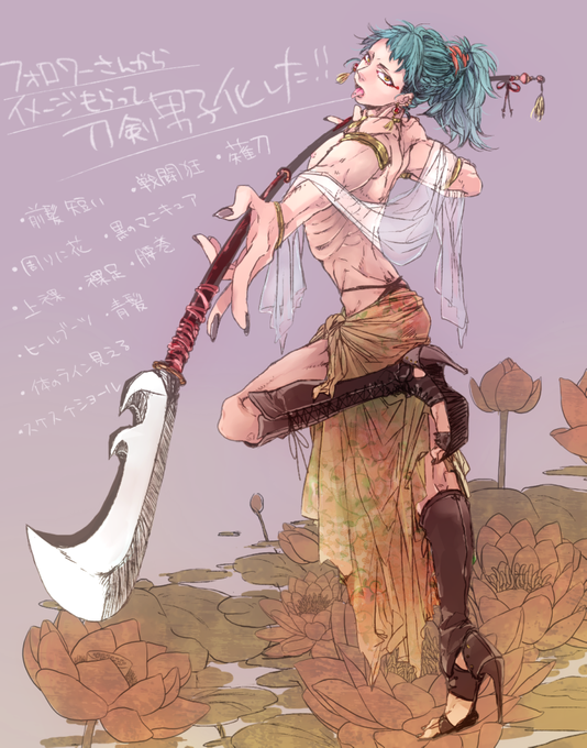 前髪短い、戦闘狂、周りに花舞ってる、黒のマニキュア、薙刀、青髪、裸足、ヒールのブーツ、体のラインが一部見える、上裸、スケスケショール、下半身に長い腰巻 #フォロワーさんからイメージもらって自分を刀剣男子化する 描きました!