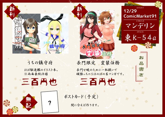 新刊は長門型ほのぼのマンガと駆逐艦イラスト本の2冊です!今年1月の砲雷撃戦の既刊も持っていきます。