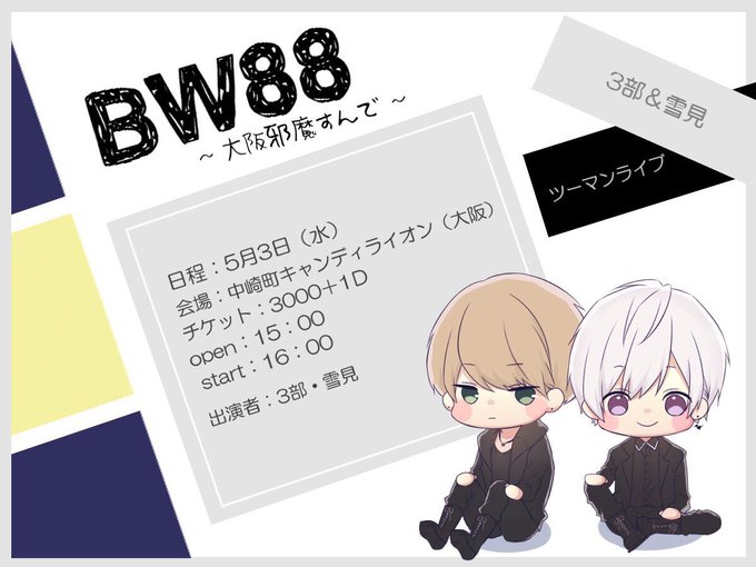 3部×雪見ツーマンLIVE 『BW88〜大阪邪魔すんで〜』 5月3日(水)@中崎町キャンディライオン(大阪梅田) OPEN:15:00 / START:16:00 出演:3部 / 雪見 3月11日チケット発売 LIVE公式アカウント( @BW88_3mi ) #BW88