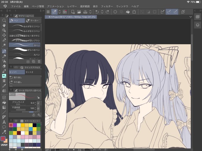 完成しましたー!!! 初描き多かったけど頑張った~ 描いてて楽しかったのは魔理沙と早苗 #東方Project