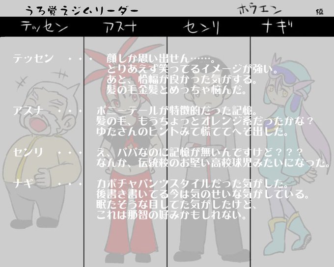 #うろおぼえジムリ図鑑 寝なければまだ今日なので!!うろ覚え図鑑ジムリーダー編はじまるよ! 等身が定まらなかったからミニキャラで参戦する……。